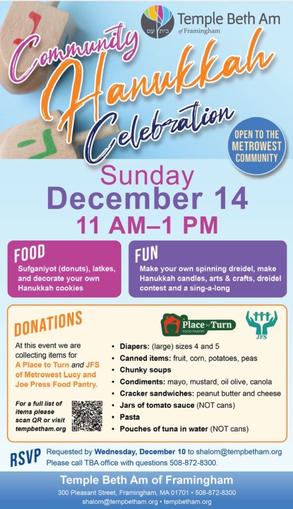 Temple Beth Am is a warm and vibrant Reform Jewish community located in Framingham, MA, comprised of members from the greater Metro West area. Founded in 1956 and affiliated with the Union for Reform Judaism, members and visitors find a relaxed and informal atmosphere in which people of all ages, backgrounds & orientations come to worship, learn, enjoy music, explore Judaism, & find new friends.